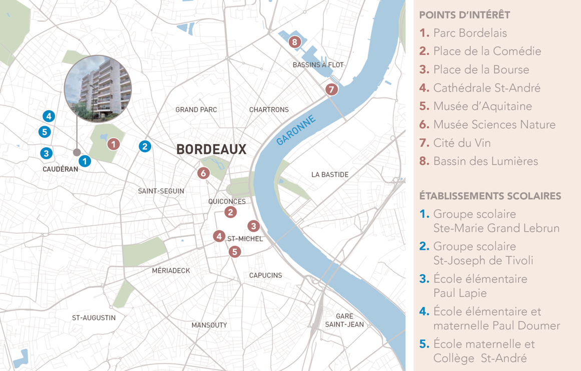 A Bordeaux, la résidence est située au 14-18-22 avenue Louis Barthou et 11-29 rue de la Cape au sein du quartier de Caudéran, réputé pour sa qualité de vie, ses espaces verts et son accessibilité. Elle est située à proximité direct des commerces de première nécessité (Intermarché, boulangerie, la Poste…).